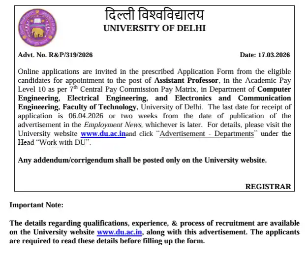 इस Delhi University Teaching Recruitment 2026 Notification के तहत आवेदन प्रक्रिया 17 मार्च 2026 से शुरू हो चुकी है और उम्मीदवार 06 अप्रैल 2026 तक ऑनलाइन आवेदन कर सकते हैं। इस भर्ती में UGC Guidelines के अनुसार चयन किया जाएगा, जिससे योग्य उम्मीदवारों को पारदर्शी तरीके से मौका मिलेगा। अगर आप भी DU Teaching Vacancy 2026, Delhi University Professor Vacancy, या Assistant Professor Recruitment 2026 जैसी सरकारी नौकरी की तैयारी कर रहे हैं, तो यह आपके लिए एक Golden Chance है।