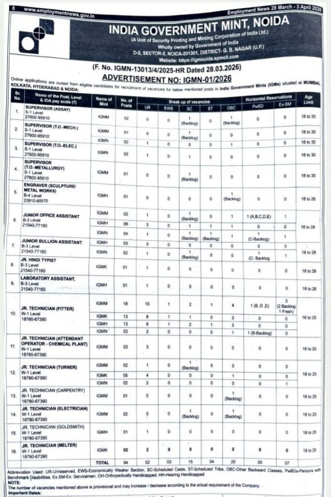 India Government Mint Recruitment 2026 के तहत कुल 94 रिक्तियां जारी की गई हैं। ये वैकेंसी सुपरवाइजर, जूनियर ऑफिस असिस्टेंट, हिंदी टाइपिस्ट, लैब असिस्टेंट और विभिन्न ट्रेड्स के जूनियर टेक्नीशियन पदों के लिए हैं।