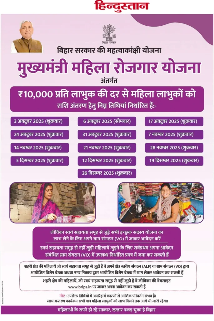 बिहार सरकार द्वारा चलाई जा रही Mukhyamantri Mahila Rojgar Yojana 2025 राज्य की महिलाओं को आर्थिक रूप से आत्मनिर्भर बनाने की दिशा में किया गया एक बड़ा और क्रांतिकारी कदम है। इस योजना का उद्देश्य है कि बिहार के हर परिवार की कम से कम एक महिला को स्वयं का रोजगार शुरू करने का अवसर मिले। रोजगार के लिए प्रारम्भिक सहायता के रूप में ₹10,000 की पहली किस्त और बाद में व्यवसायिक मूल्यांकन होने पर ₹2 लाख तक की अतिरिक्त राशि प्रदान की जाएगी। इस योजना से लाभ उठाने के लिए महिलाओं को ऑनलाइन या ग्रामीण क्षेत्रों में जीविका समूह के माध्यम से आवेदन करना होगा। योजना के माध्यम से महिलाओं को प्रशिक्षण, बाजार सुविधा, हाट बाजार, स्टॉल, वित्तीय सहायता, तकनीकी सहायता एवं रोजगार मार्गदर्शन भी उपलब्ध कराया जाएगा। यह योजना महिलाओं के जीवन में आत्मविश्वास, आत्मनिर्भरता और सम्मान की भावना विकसित करने में महत्वपूर्ण भूमिका निभाएगी।
