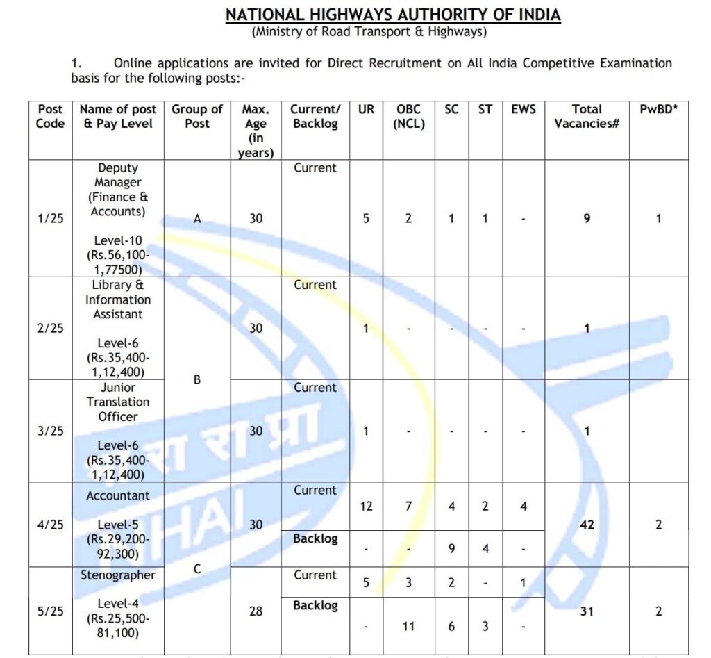NHAI ने कुल 84 रिक्तियों के लिए आवेदन आमंत्रित किए हैं, जिनका विवरण नीचे दिया गया है –