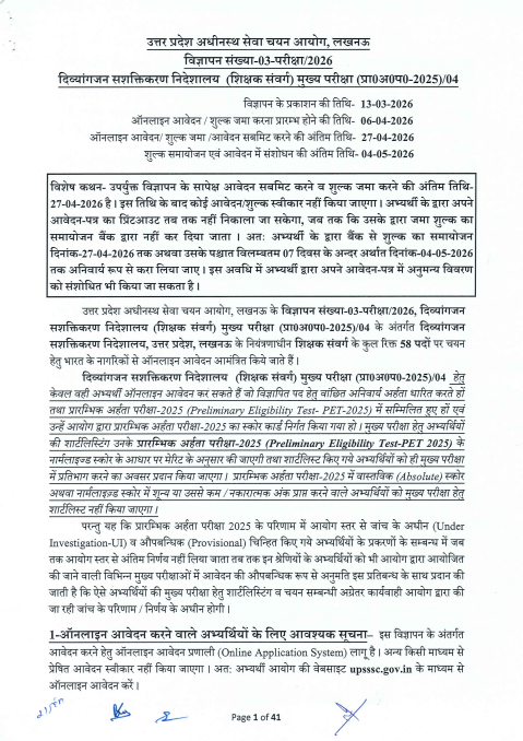 यह भर्ती UP Directorate of Empowerment of Persons with Disabilities के अंतर्गत निकाली गई है। UPSSSC Teacher Notification 2026 के अनुसार कुल 58 पदों पर भर्ती होगी। आवेदन प्रक्रिया पूरी तरह ऑनलाइन है और उम्मीदवार आधिकारिक वेबसाइट के माध्यम से फॉर्म भर सकते हैं। इस भर्ती में चयन PET 2025 स्कोर और मुख्य परीक्षा के आधार पर किया जाएगा। सरकारी शिक्षक की नौकरी स्थिरता और सम्मान दोनों देती है, इसलिए यह भर्ती उम्मीदवारों के लिए बहुत महत्वपूर्ण है।